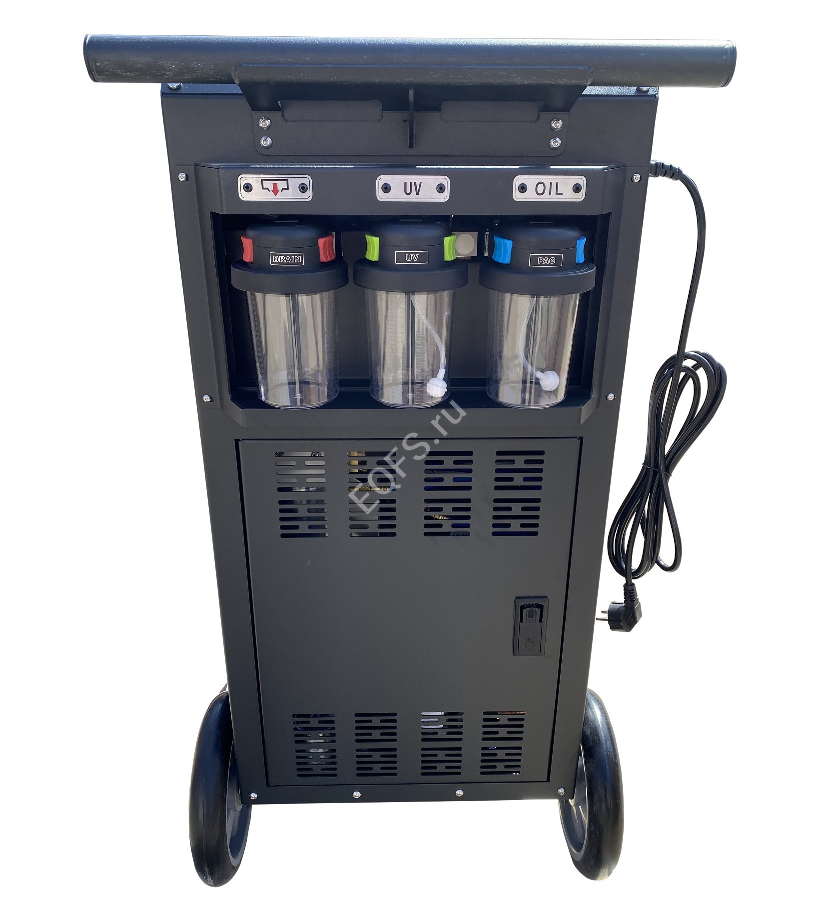 Полностью автоматическая станция для заправки автомобильных кондиционеров. Цветной сенсорный LCD дисплей. Меню на Русском языке. База данных выбор по марке, году выпуска, объему двигателя. Автоматически выполняет отбор, отделение, восстановление и заправку хладагента и масла. Визуальный контроль работы по манометрам. Электронные весы для фреона, масла и УФ добавки.