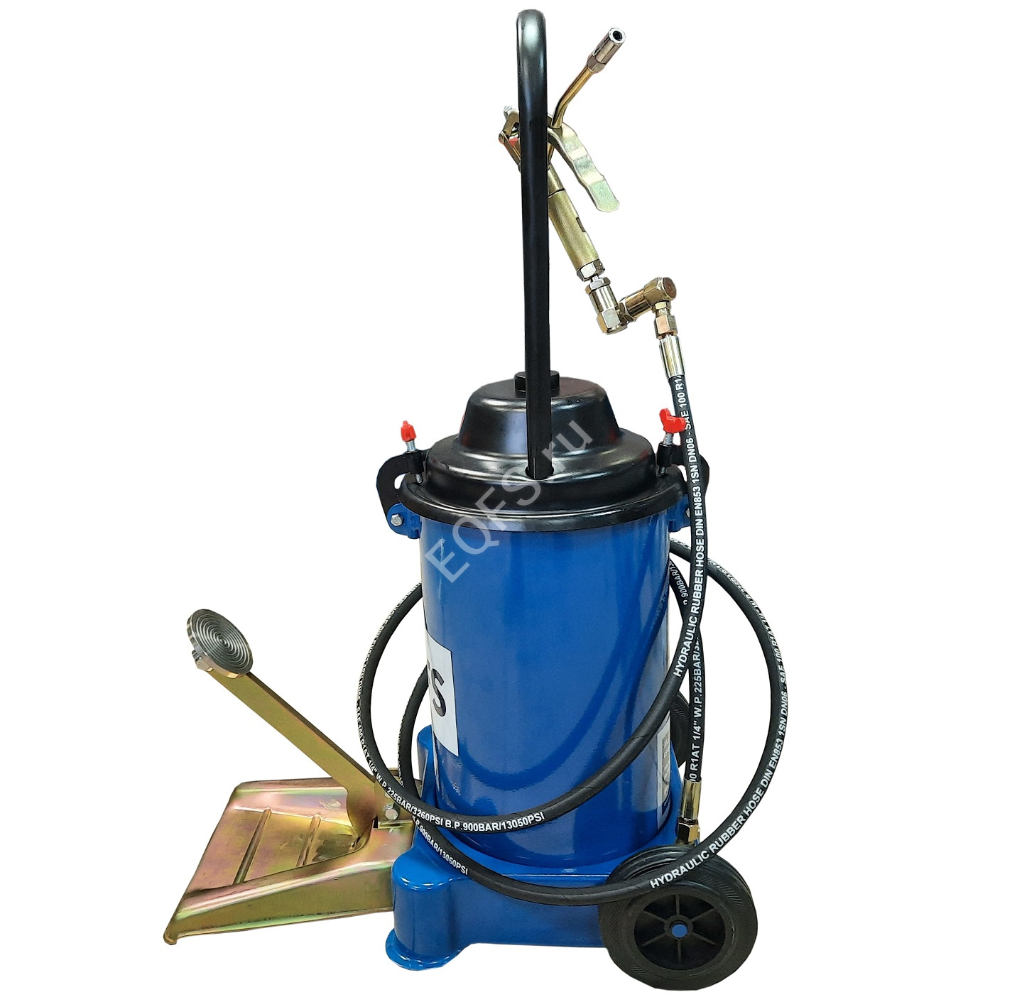 Ножной привод. На колесах, имеет легкий вес и экономичную конструкцию для удобства перемещения и эксплуатации. Передовые технологии изготовления из материалов высшего класса, отличная производительность перекачки гарантирует долговечность и безопасность в условиях работы под высоким давлением. Емкость бака 13 кг. Давление смазки 350-400 Атм. Пистолет с наконечником производительность 350-400 г/мин. Габариты: 520X385X350 мм, вес 10 кг, длина шланга 2,5м.