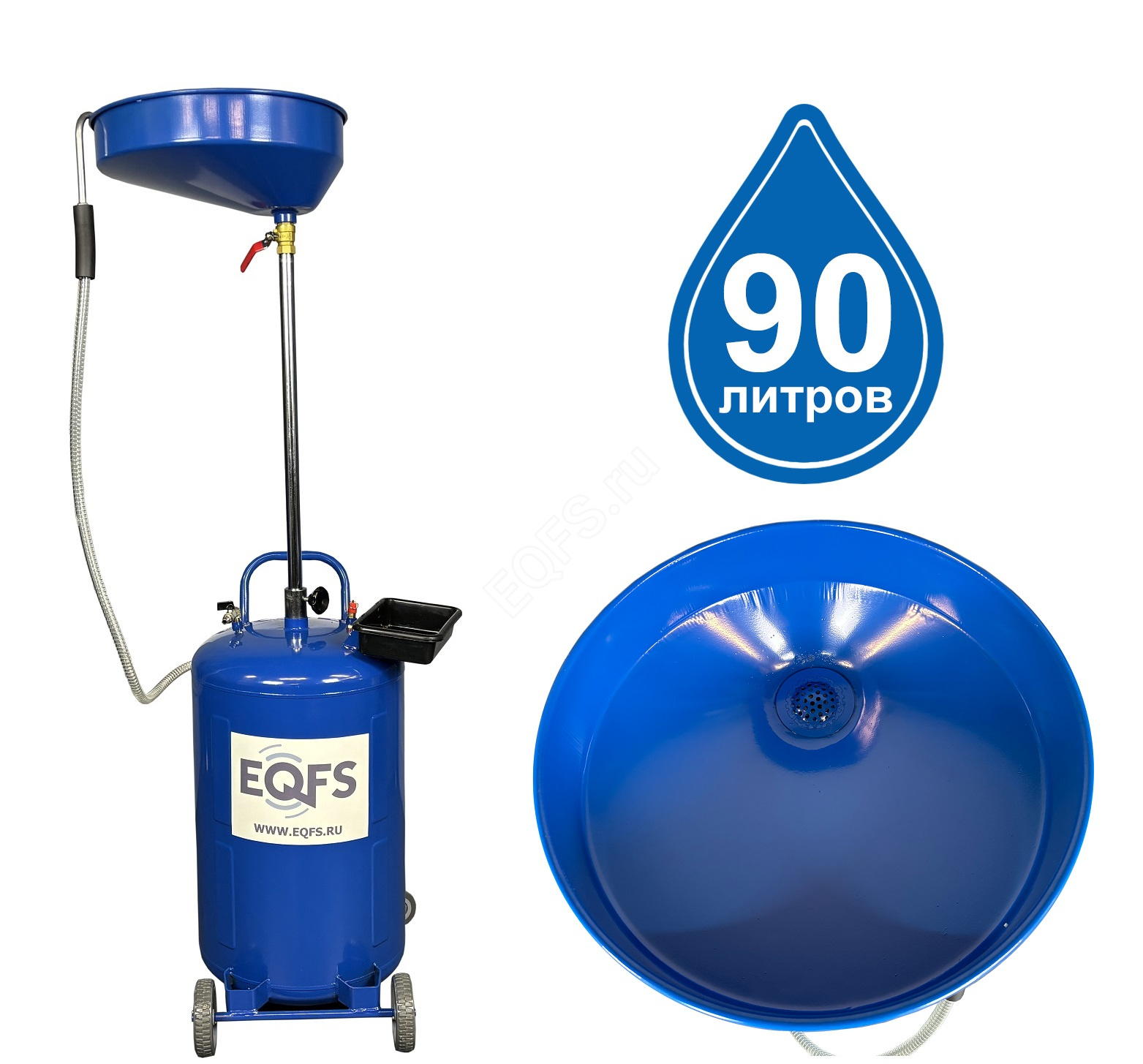 Маслосборник помещает 90 литров отработанного масла или техжидкости. Бак 80л и чаша (воронка) 10л.