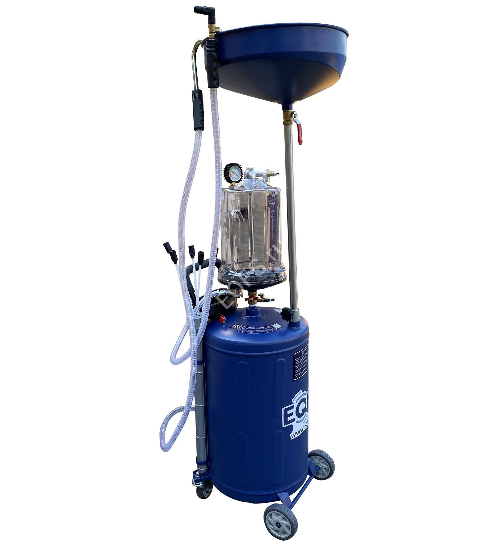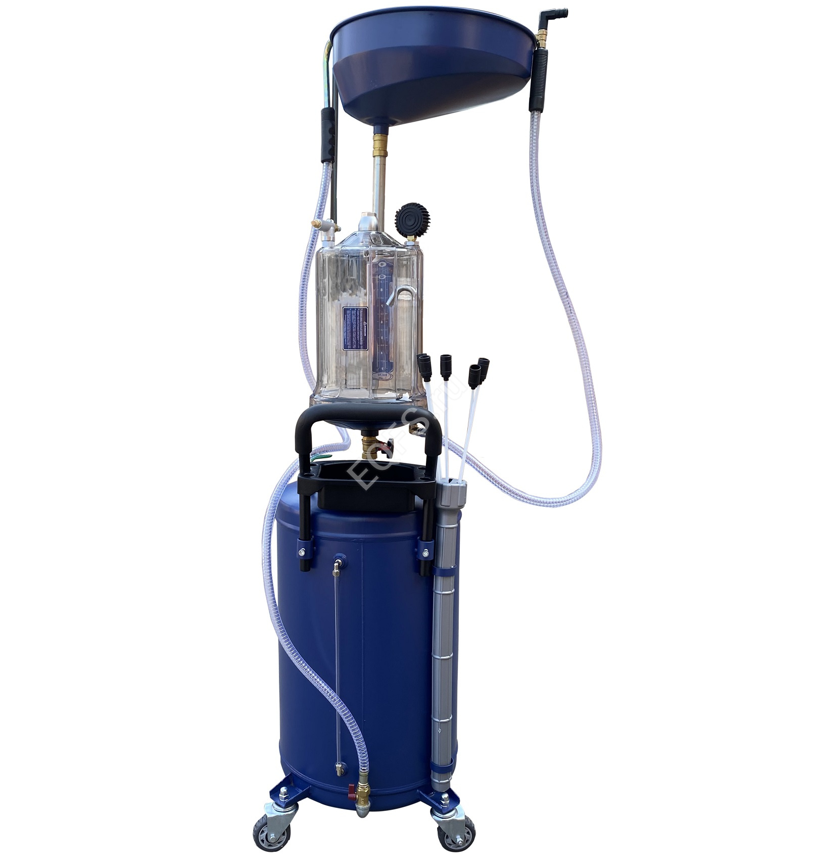 Установка для слива и откачки щупами масла и антифриза из ДВС, КПП и мостов. В комплекте: Колба с особо прочным пластиком + Сливная чаша с сеткой для улавливания мелких деталей + Щупы гибкие 5 шт. + Лоток для сливной пробки + Металлические пистолеты для откачки масла + визуальный контроль уровня отработки+ стрелочная индикация уровня разрежения в установке + Быстросъёмный штуцер для пневмолинии + Сепаратор для выхода воздуха. Вмещает 100 л. = Бак 80л + колба 10 л. + сливная воронка 10л.Технические особенности установки для слива и откачки масла щупами ES-2297: