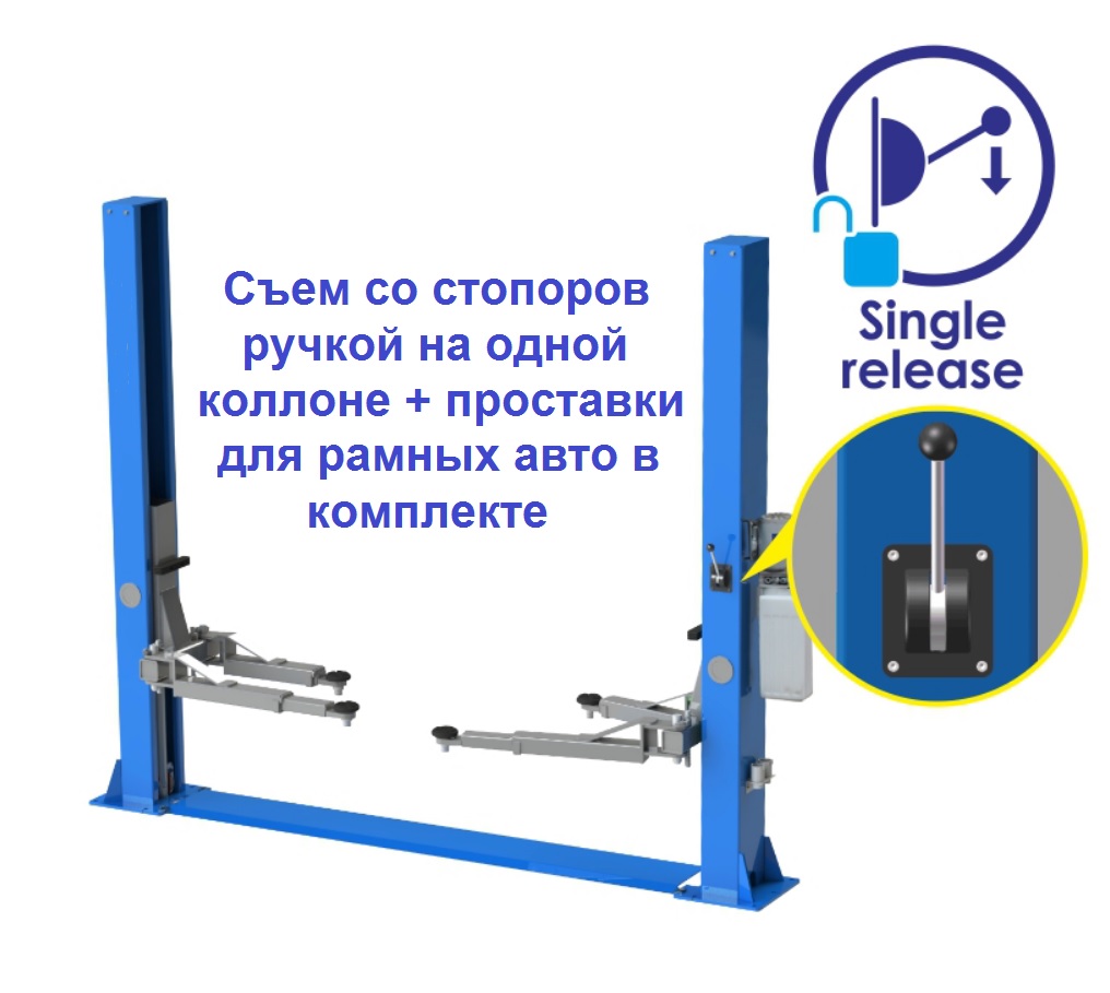 Модернизированный двухстоечный подъемник, гидравлический, с нижней синхронизацией г/п. 4т. Срок эксплуатации – не ограничен. Съем со стопоров ручкой на одной колонне + проставки для рамных авто. Подъём 110÷1825 мм. Ширина проезда – 2560 мм.